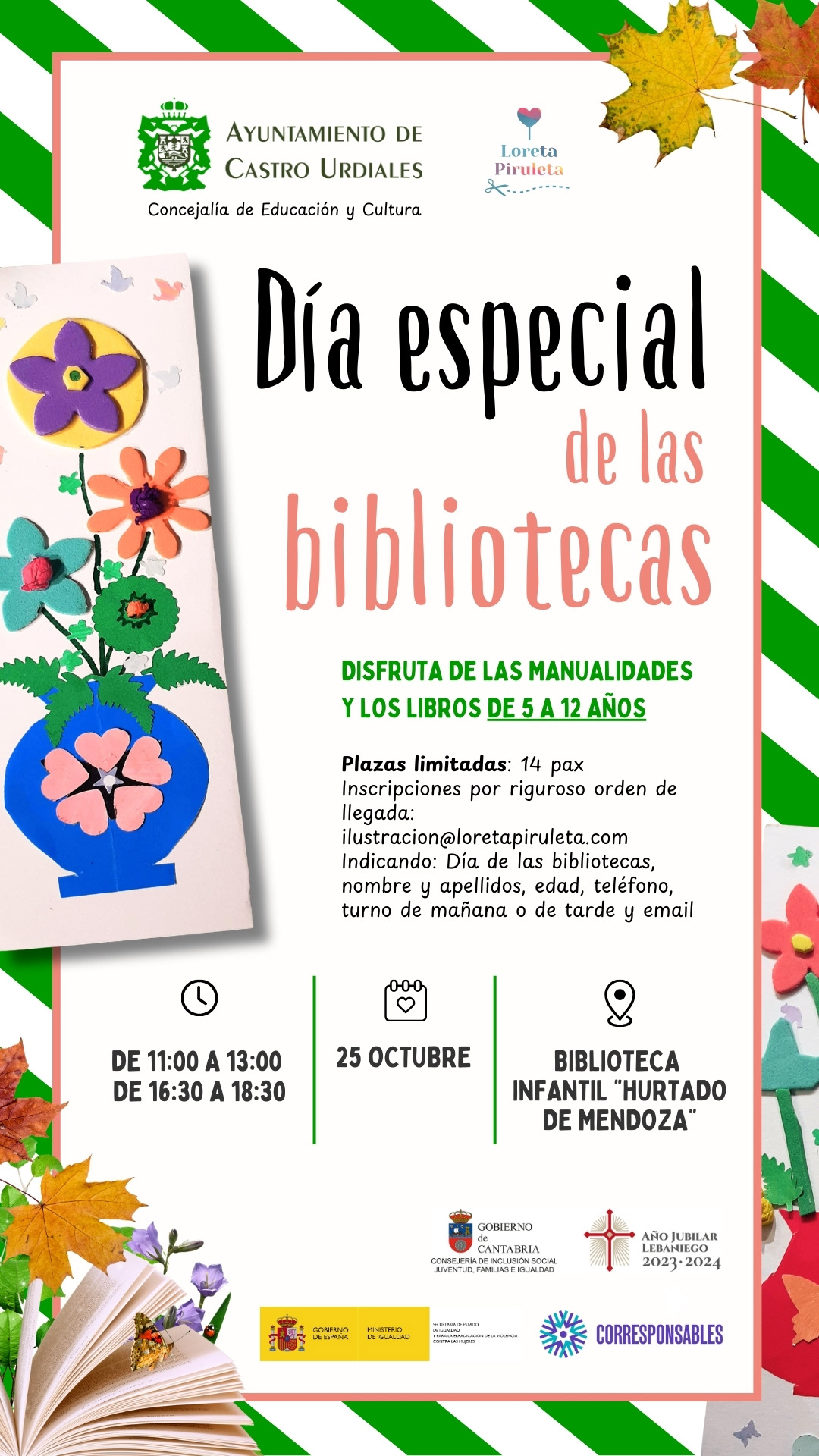 Indicando: Día de las bibliotecas, nombre y apellidos (niño/a y adulto), edad, teléfono, turno de mañana o de tarde y email