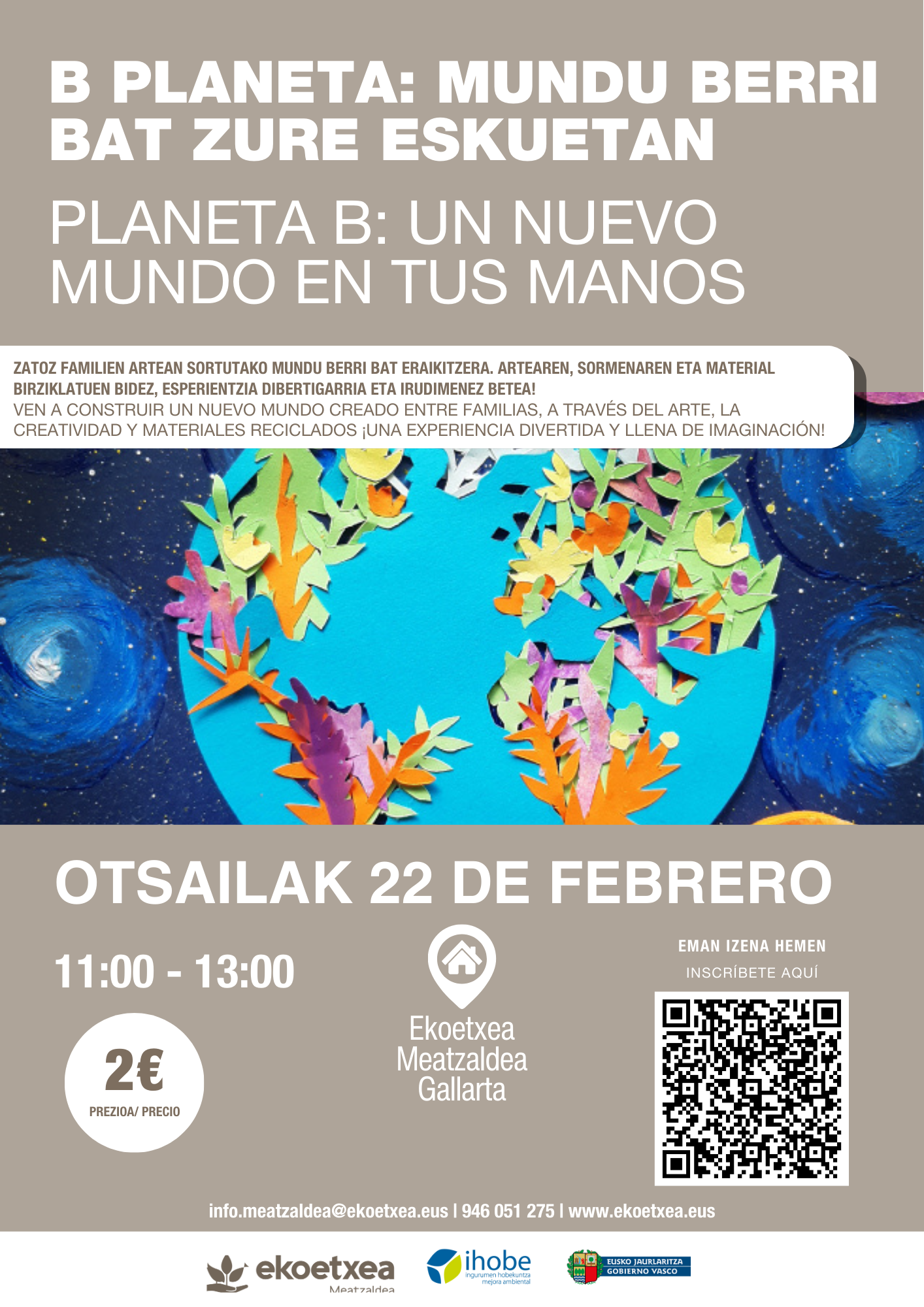 Se propone un taller creativo que combina narrativa ficticia, expresión artística y educación ambiental. Partimos de una historia: un planeta Tierra agotado y un nuevo planeta por construir. A través de dinámicas lúdicas, técnicas plásticas y trabajo colaborativo, los y las participantes elaborarán un gran mural colectivo del “Planeta B”, lleno de ideas sostenibles, soluciones imaginativas y elementos visuales creados con materiales reciclados. Un claro ejemplo de economía circular.