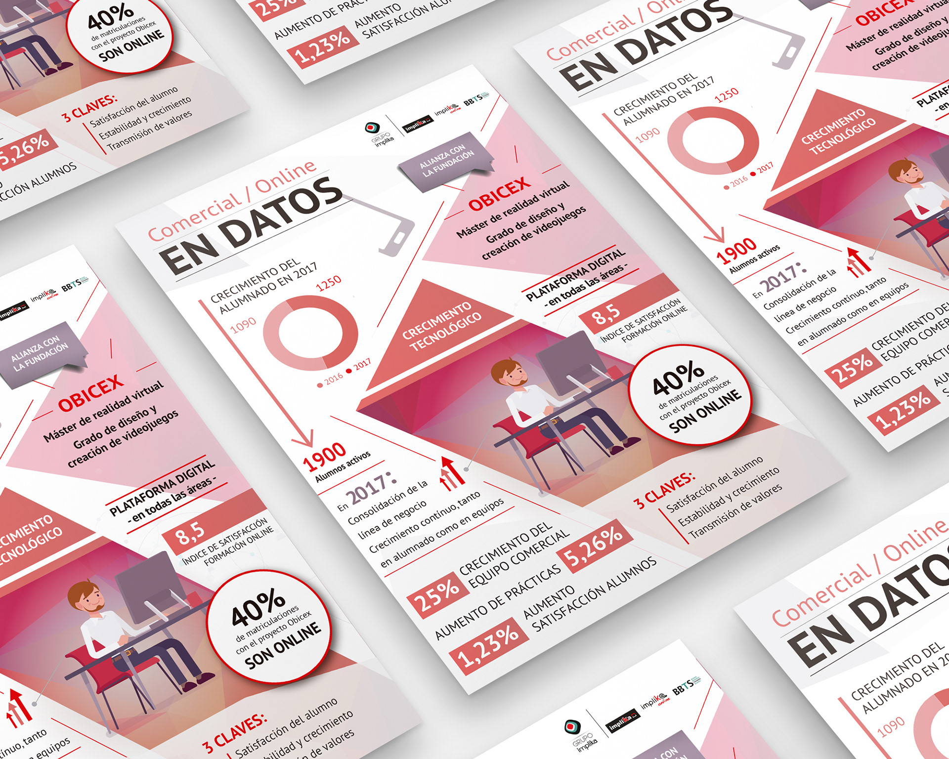 Flyers diseñados para evento anual de Implika, con datos de los diferentes Departamentos de la Organización en formato infografía para acompañar en la conferencia presencial.